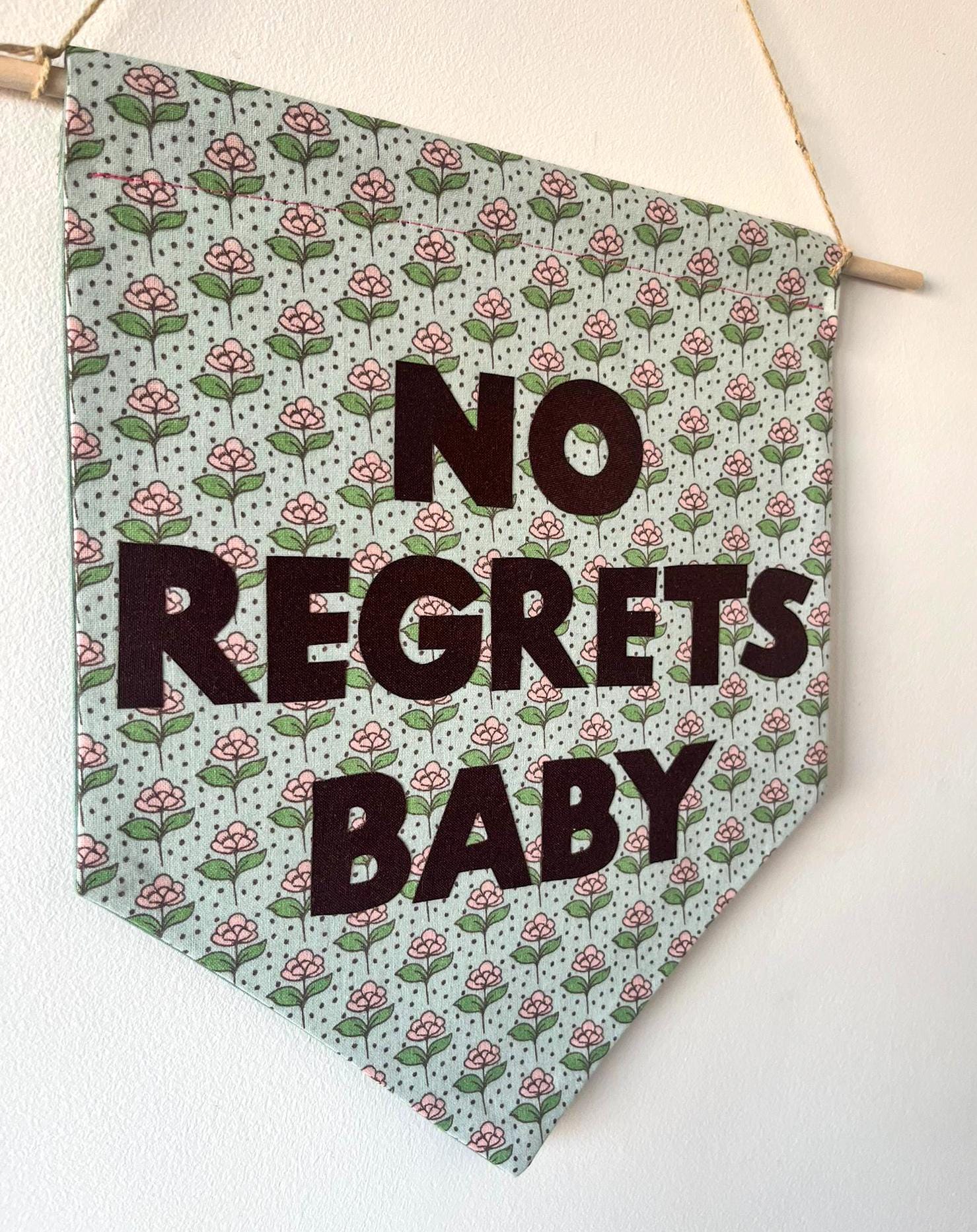 Wall banner with 'No Regrets Baby' quote, inspired by th Kacey Musgraves song Deeper Well, it makes the perfect gift for any fan of the singer. Cute floral cotton fabric with brown lettering.