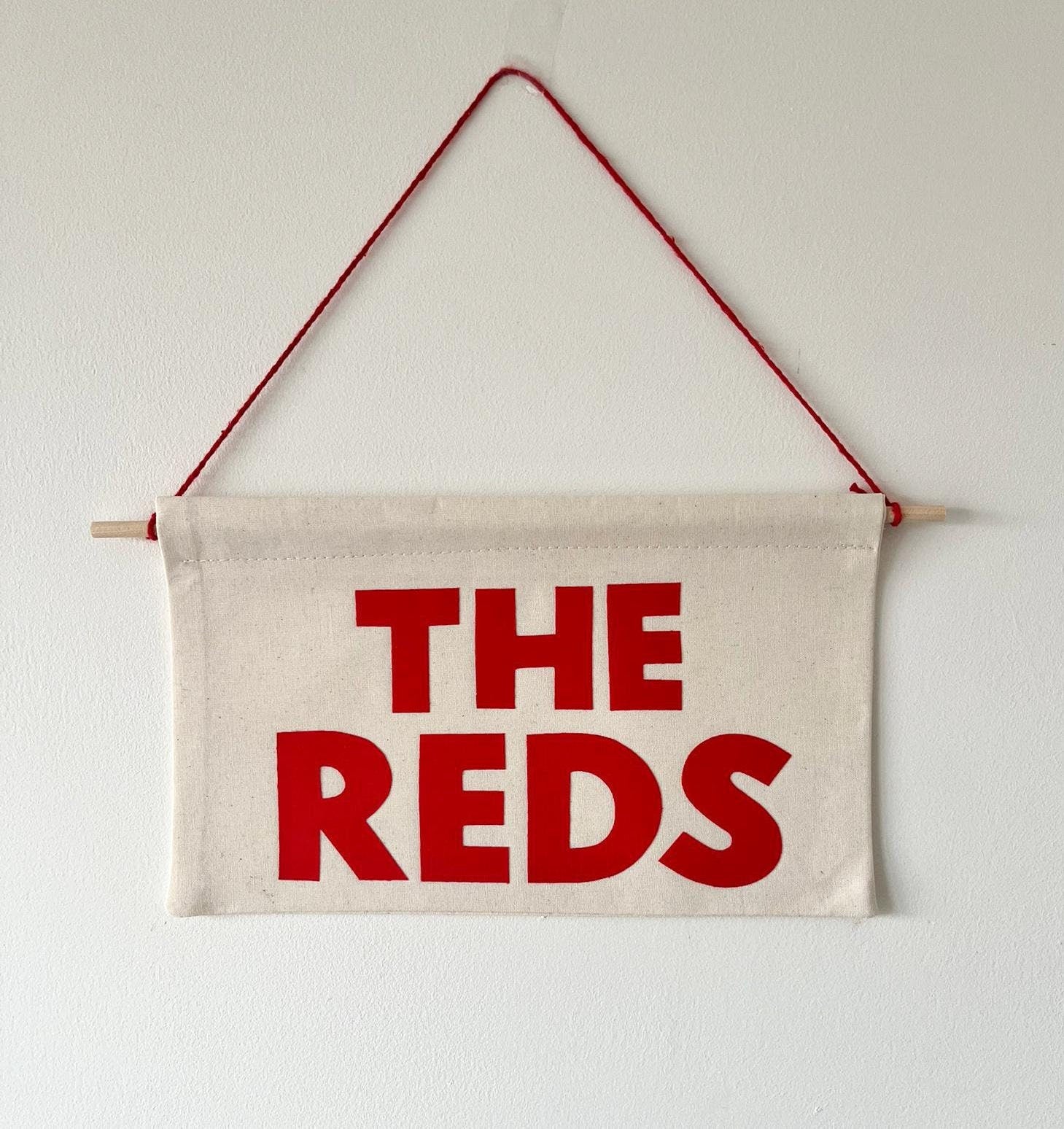 Wall banner/pennant with 'The Reds' design. Would make a great gift for any Liverpool fan or if you support another team in red! The banner can be hung anywhere around the home. Natural/cream cotton with red lettering.