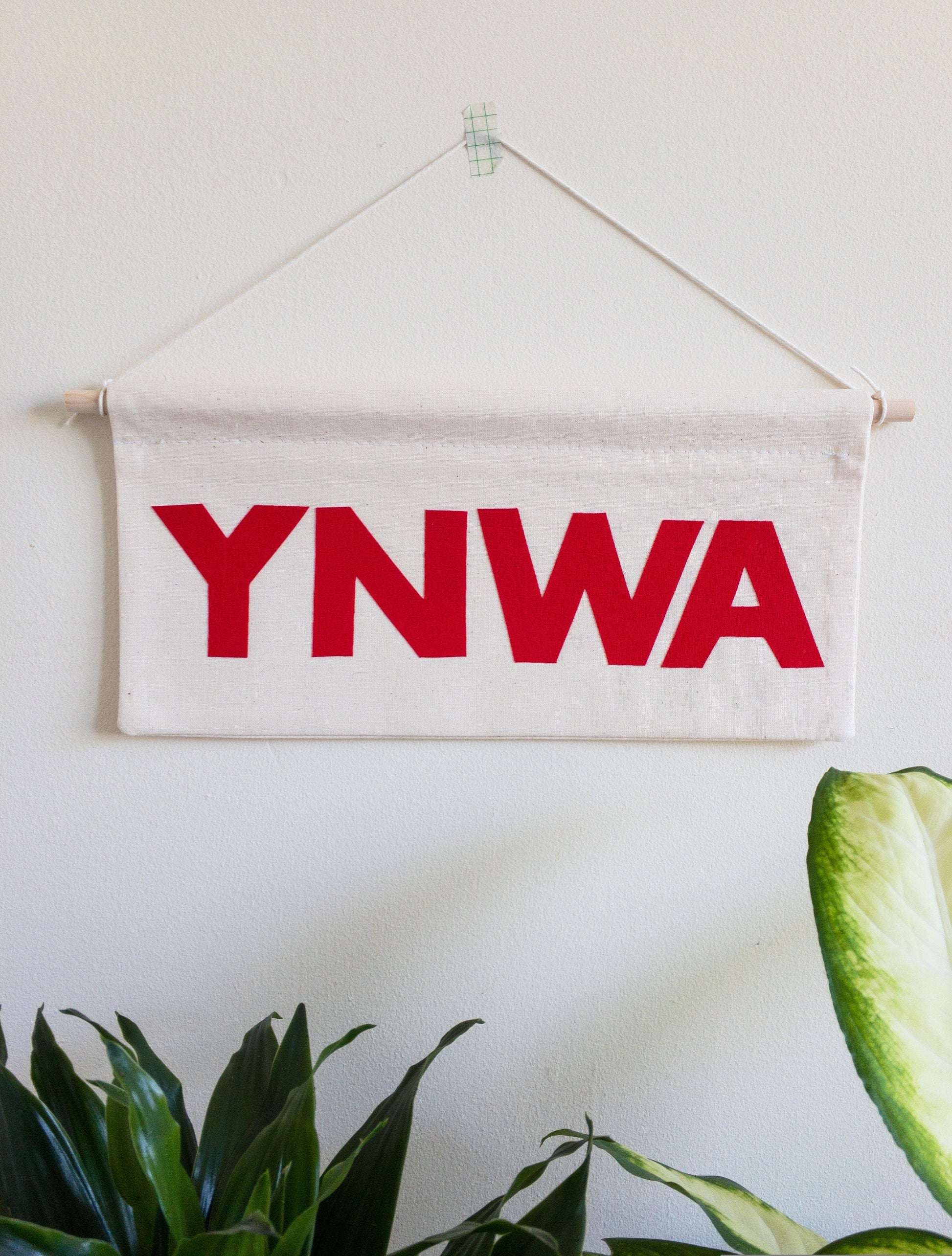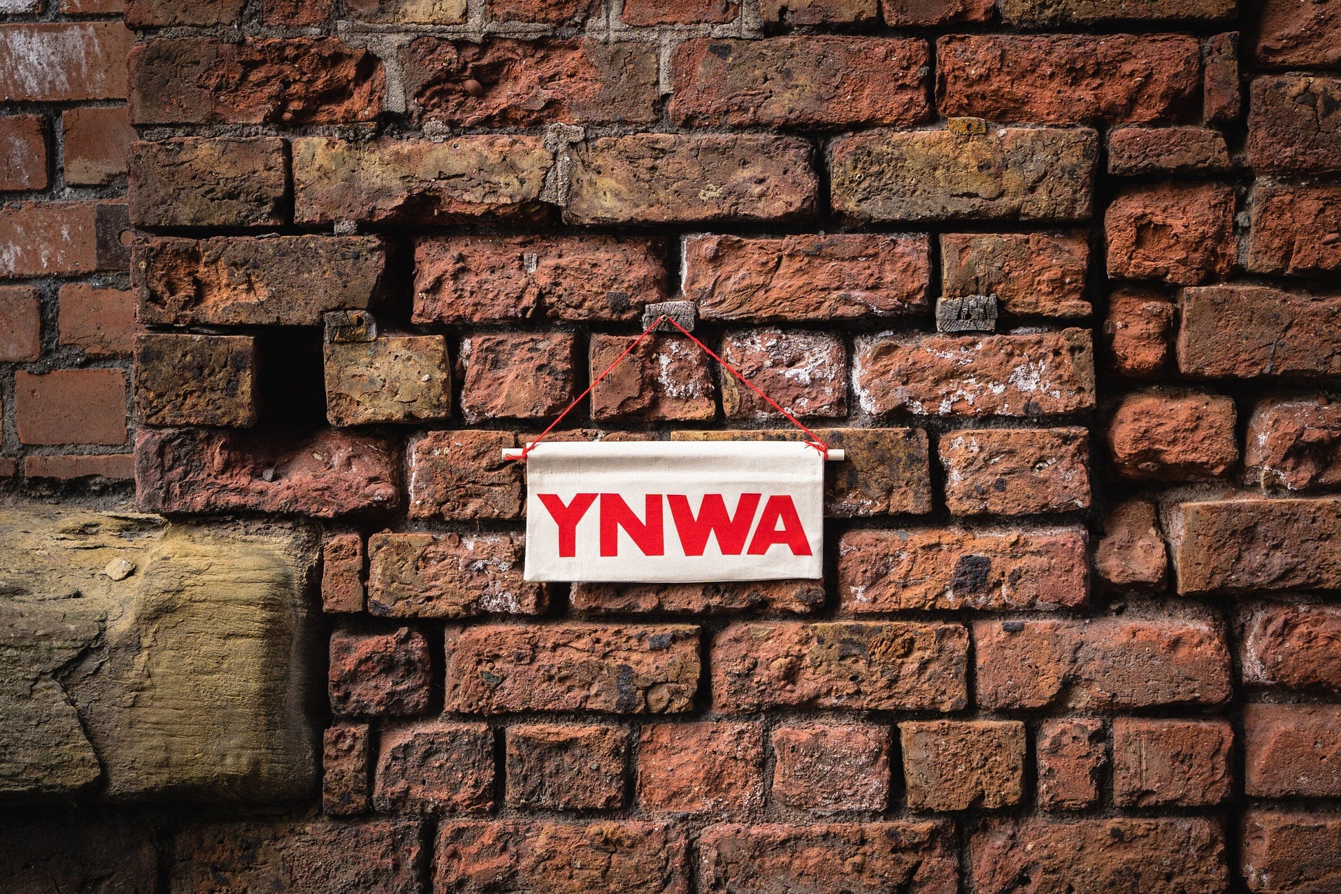 Liverpool inspired 'YNWA' long rectangle wall banner, natural seeded cotton fabric with red lettering. Can be hung anywhere around the home and makes a perfect gift for a Red!